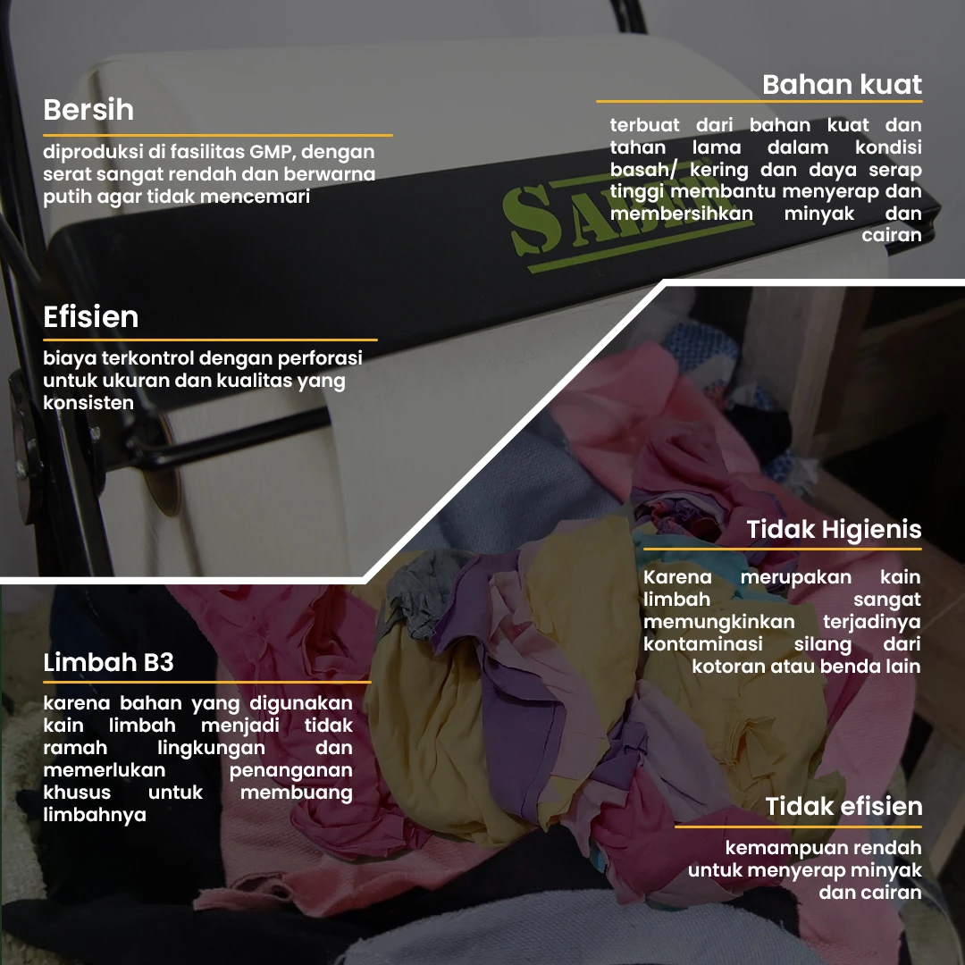 Industrial wipes yang didesain khusus dengan teknologi hydro-entangled untuk pekerjaan pembersihan dalam keadaan kering atau yang membutuhkan celup-bilas, untuk menghilangkan kotoran, minyak, oli dan debu, pada mesin, komponen dan peralatan kerja di pabrik dan bengkel.