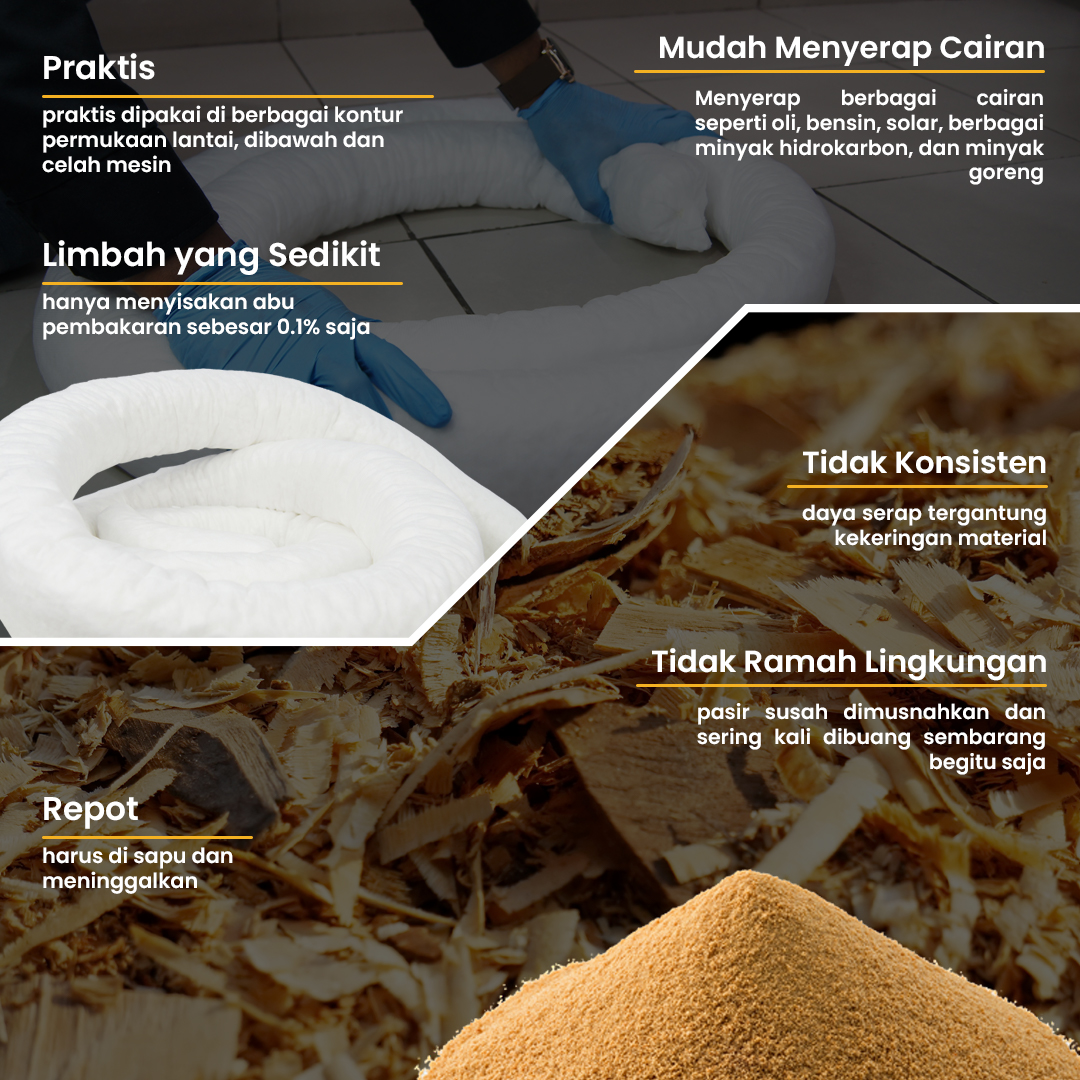 Penyerap khusus minyak dan cairan hidrokarbon yang didesain khusus dalan bentuk guling (boom) untuk mampu melokalisir dan menyerap dengan cepat dan praktis, sehingga pekerjaan selalu aman (safe) dan ramah lingkungan. Daya serapnya 9-11 kali lipat. Bisa dipakai untuk berbagai kebutuhan penyerapan minyak di lantai pabrik, lapangan, bengkel dan lokasi kerja lainnya, serta di atas air.