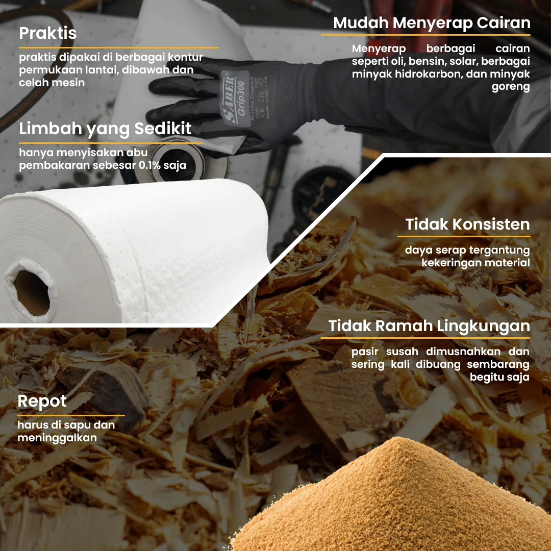 4. Cocok menyerap berbagai jenis oli (mesin, hidrolik, transmisi, cutting fluid), bensin, solar, dan minyak industri lainnya.