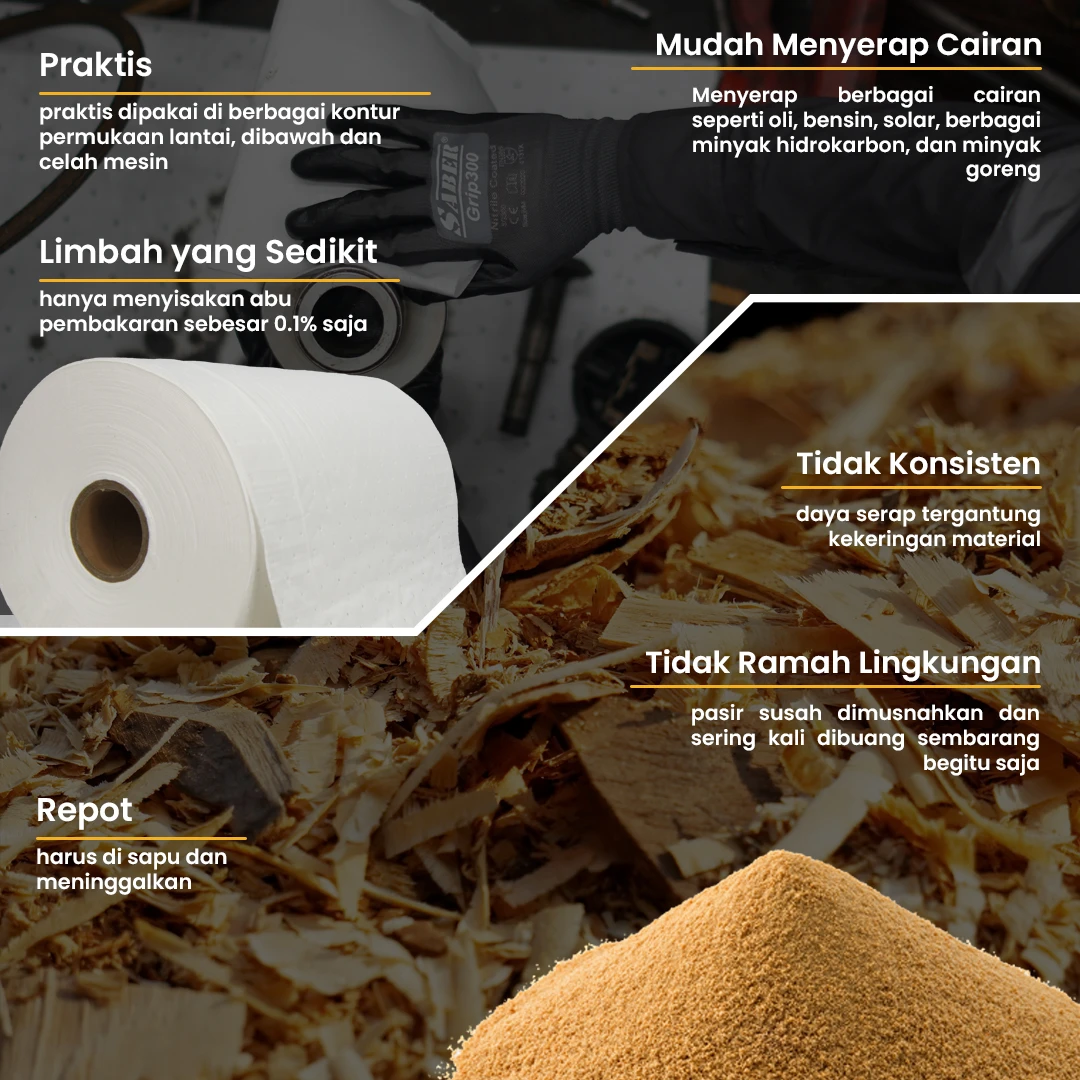 4. Cocok menyerap berbagai jenis oli (mesin, hidrolik, transmisi, cutting fluid), bensin, solar, dan minyak industri lainnya.